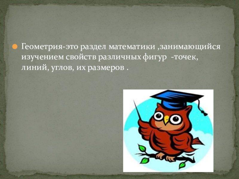 Слайд 7Геометрия-это раздел математики ,занимающийся изучением свойств различных фигур -точек, линий, углов,