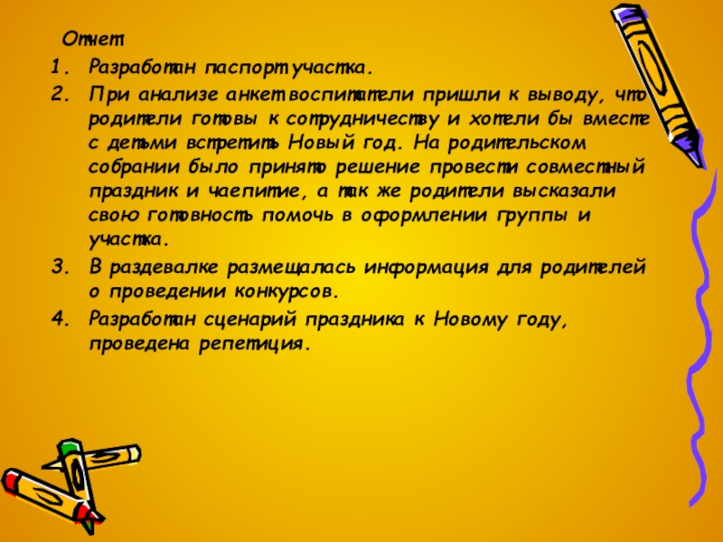 готовы к сотрудничеству и хотели бы вместе с детьми встретить Новый год. На родительском собрании было принято решение провести совместный праздник и чаепитие, а так же родители высказали свою готовность помочь в оформлении группы и участка.