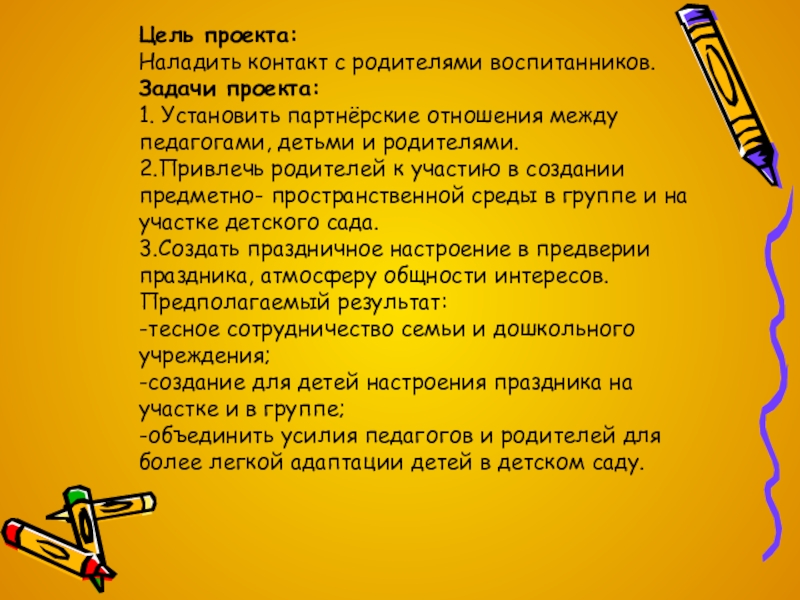 является установление теплых доверительных отношений, эмоционального контакта между педагогами и родителями, между родителями и детьми.