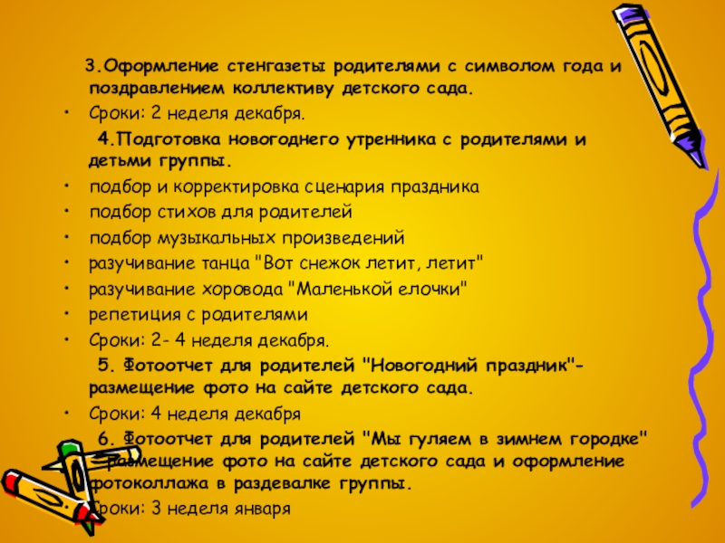 4.Подготовка новогоднего утренника с родителями и детьми группы.
