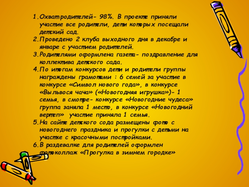 Охват родителей- 98%. В проекте приняли участие все родители, дети которых
