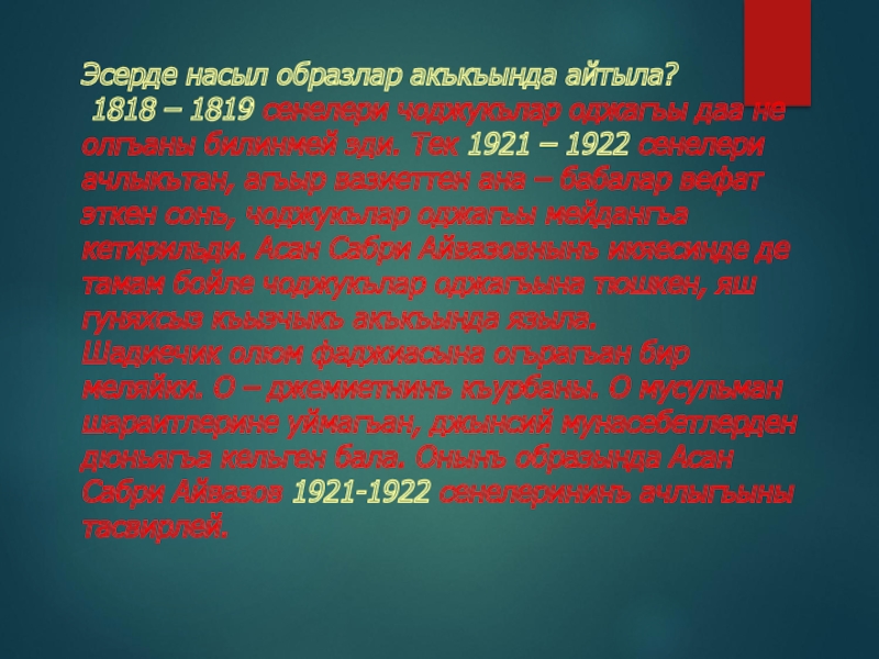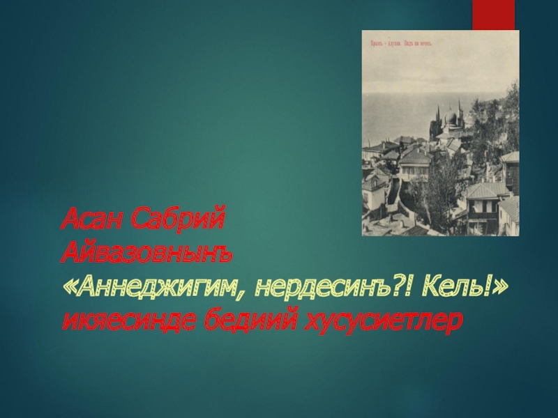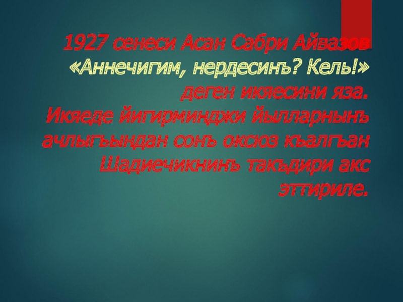Слайд 111927 сенеси Асан Сабри Айвазов «Аннечигим, нердесинъ? Кель!» деген икяесини яза.