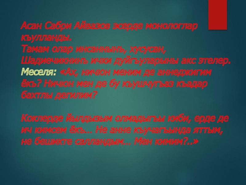 Слайд 19Асан Сабри Айвазов эсерде монологлар къулланды.