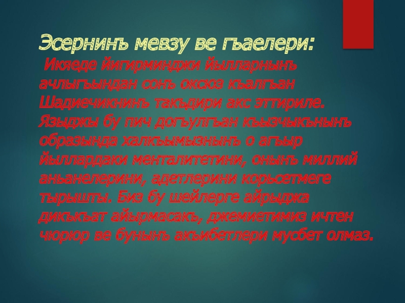 Слайд 12Эсернинъ мевзу ве гъаелери:
