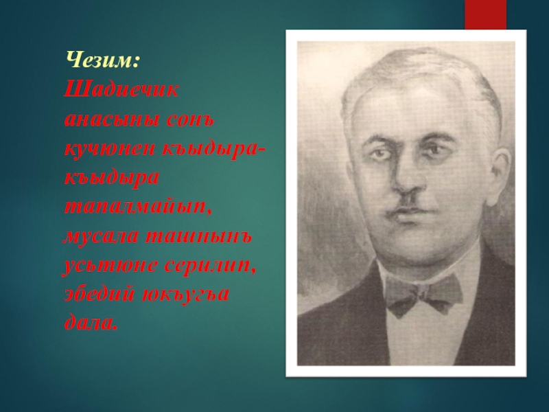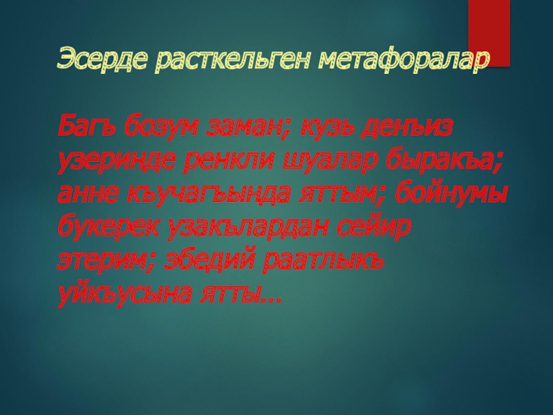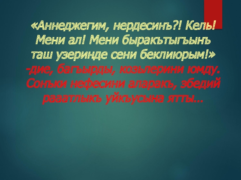 Слайд 20«Аннеджегим, нердесинъ?! Кель! Мени ал! Мени быракътыгъынъ таш узеринде сени беклиюрым!»