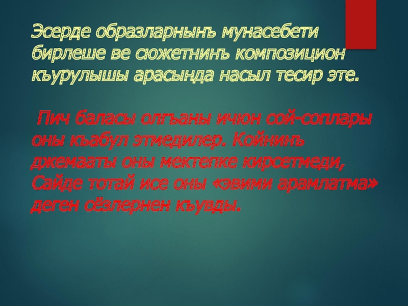 Слайд 16Эсерде образларнынъ мунасебети бирлеше ве сюжетнинъ композицион къурулышы арасында насыл тесир