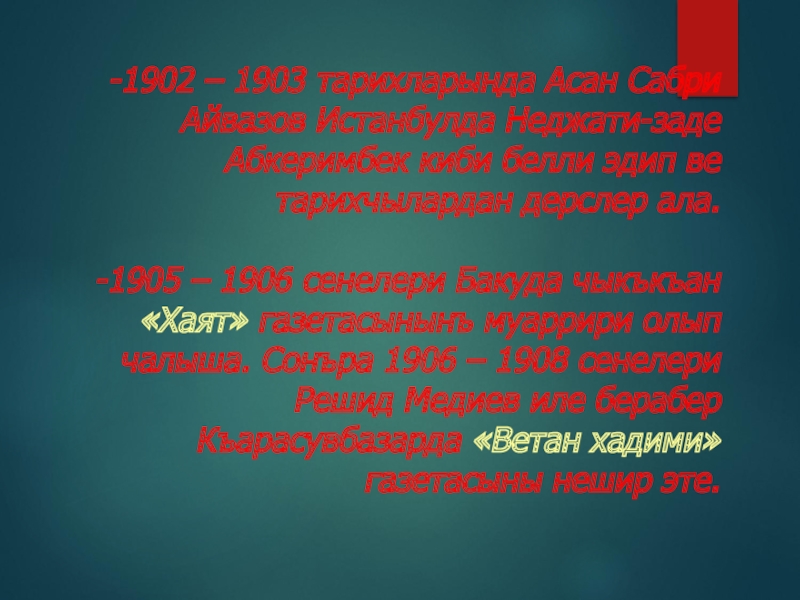Слайд 6-1902 – 1903 тарихларында Асан Сабри Айвазов Истанбулда Неджати-заде Абкеримбек киби