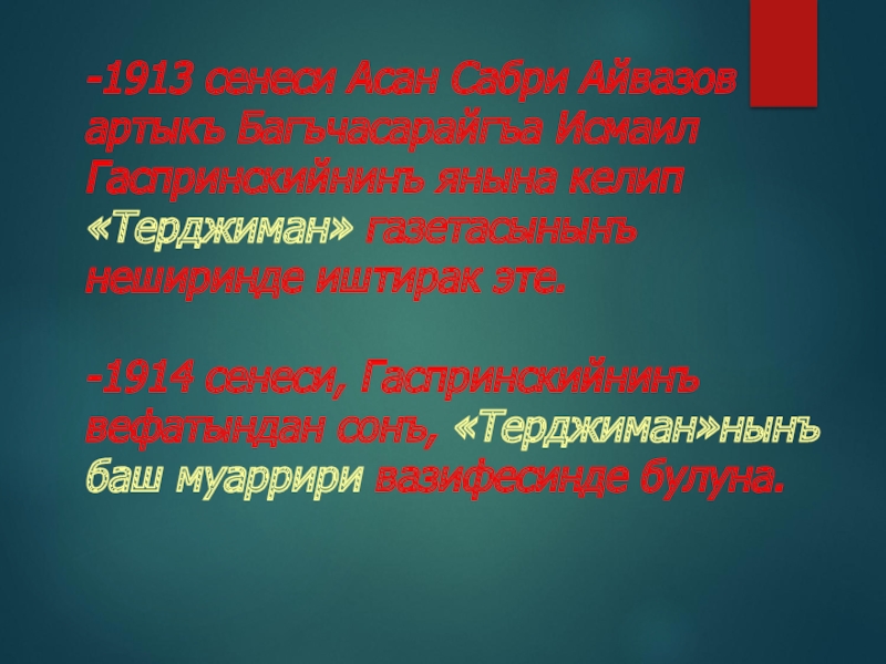 Слайд 7-1913 сенеси Асан Сабри Айвазов артыкъ Багъчасарайгъа Исмаил Гаспринскийнинъ янына келип