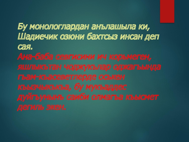 Слайд 21Бу монологлардан анълашыла ки, Шадиечик озюни бахтсыз инсан деп сая.