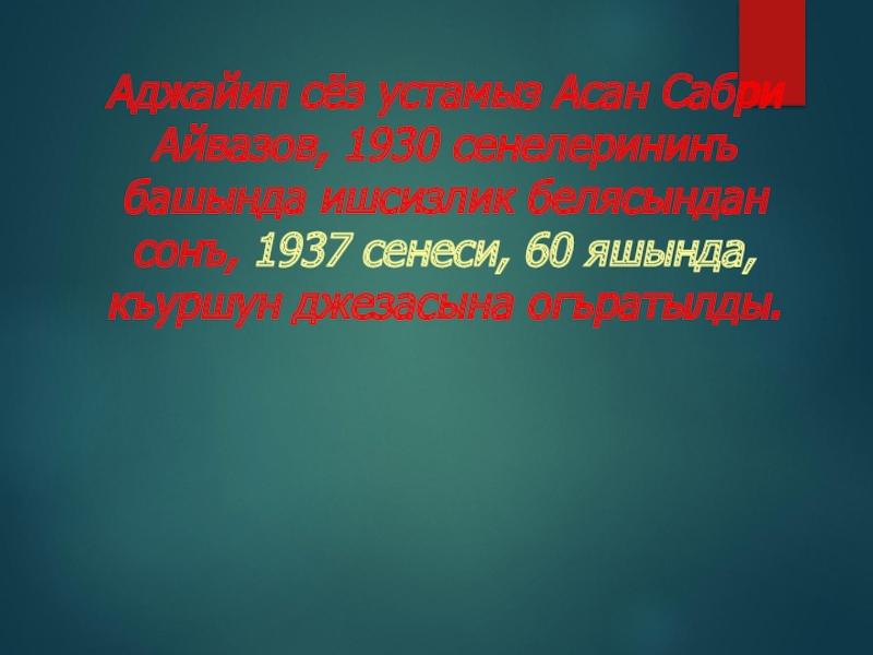 Слайд 9Аджайип сёз устамыз Асан Сабри Айвазов, 1930 сенелерининъ башында ишсизлик белясындан