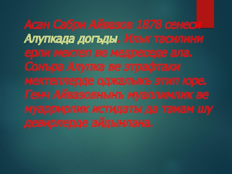 Слайд 3Асан Сабри Айвазов 1878 сенеси Алупкада догъды. Ильк тасилини ерли мектеп