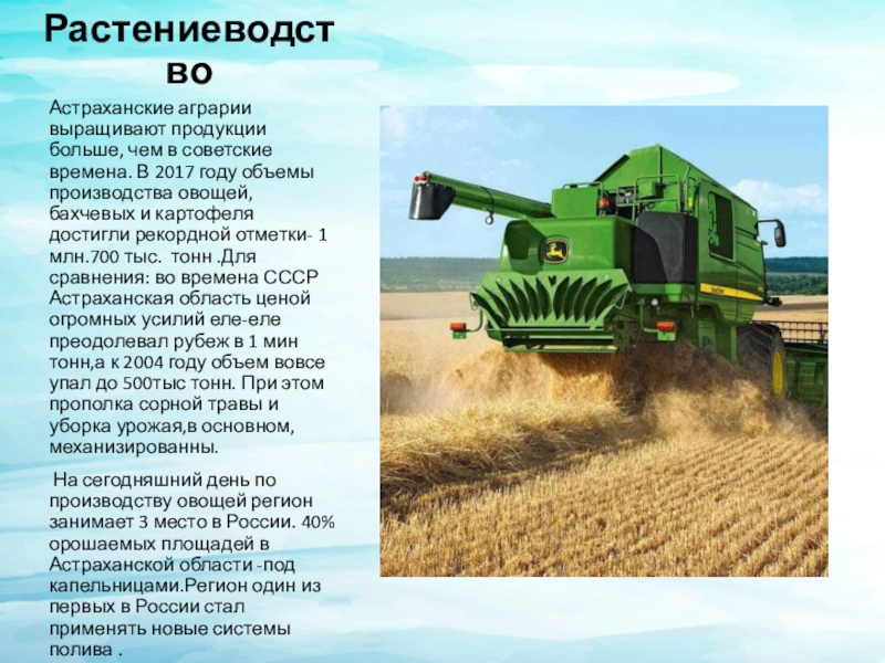 На сегодняшний день по производству овощей регион занимает 3 место в России. 40% орошаемых площадей в Астраханской области -под капельницами.Регион один из первых в России стал применять новые системы полива .