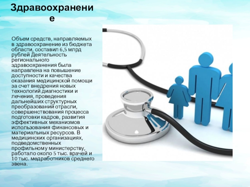 рублей Деятельность регионального здравоохранения была направлена на повышение доступности и качества оказания медицинской помощи за счет внедрения новых технологий диагностики и лечения, проведения дальнейших структурных преобразований отрасли, совершенствования процесса подготовки кадров, развития эффективных механизмов использования финансовых и материальных ресурсов. В медицинских организациях, подведомственных профильному министерству, работало около 5 тыс. врачей и 10 тыс. медработников среднего звена.