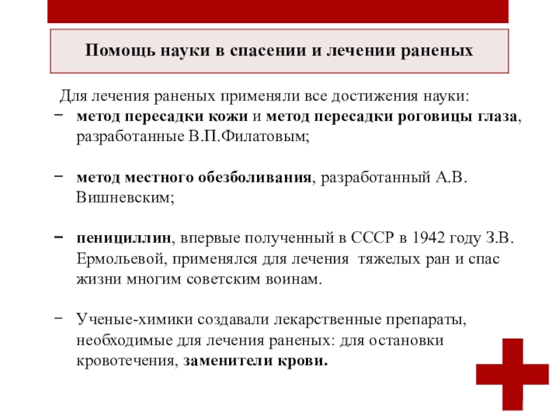 пенициллин, впервые полученный в СССР в 1942 году З.В. Ермольевой, применялся для лечения тяжелых ран и спас жизни многим советским воинам.
