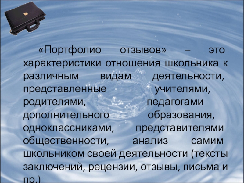 Учителя, администрация школы, руководители исследовательских и проектных работ, педагоги дополнительного образования имеют право составления отзывов и рецензий для портфолио о проделанной учащимися работе.