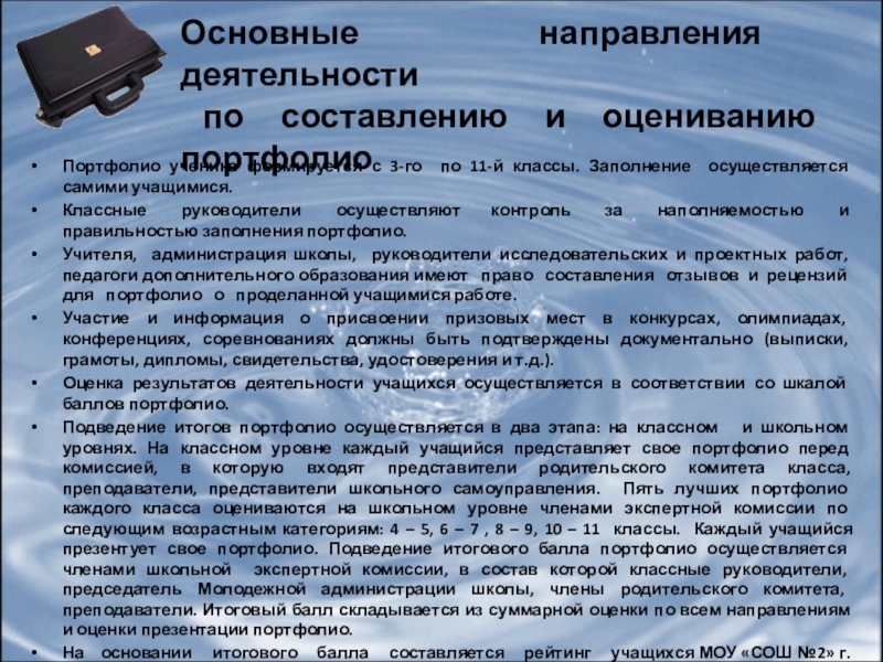 Подведение итогов портфолио осуществляется в два этапа: на классном и школьном уровнях. На классном уровне каждый учащийся представляет свое портфолио перед комиссией, в которую входят представители родительского комитета класса, преподаватели, представители школьного самоуправления. Пять лучших портфолио каждого класса оцениваются на школьном уровне членами экспертной комиссии по следующим возрастным категориям: 4 – 5, 6 – 7 , 8 – 9, 10 – 11 классы. Каждый учащийся презентует свое портфолио. Подведение итогового балла портфолио осуществляется членами школьной экспертной комиссии, в состав которой классные руководители, председатель Молодежной администрации школы, члены родительского комитета, преподаватели. Итоговый балл складывается из суммарной оценки по всем направлениям и оценки презентации портфолио.