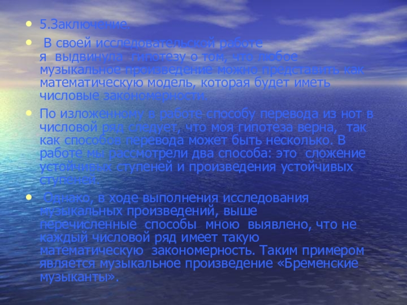 По изложенному в работе способу перевода из нот в числовой ряд следует, что моя гипотеза верна, так как способов перевода может быть несколько. В работе мы рассмотрели два способа: это сложение устойчивых ступеней и произведения устойчивых ступеней.