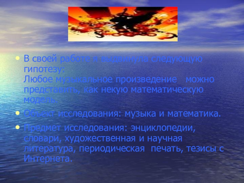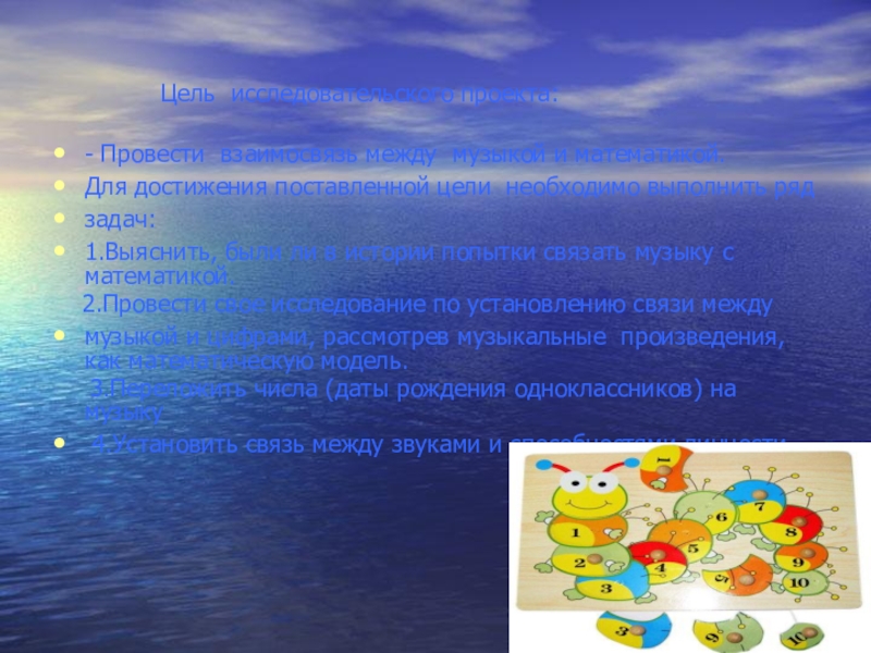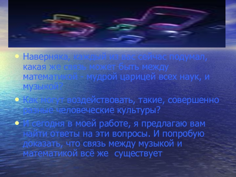 И сегодня в моей работе, я предлагаю вам найти ответы на эти вопросы. И попробую доказать, что связь между музыкой и математикой всё же существует
