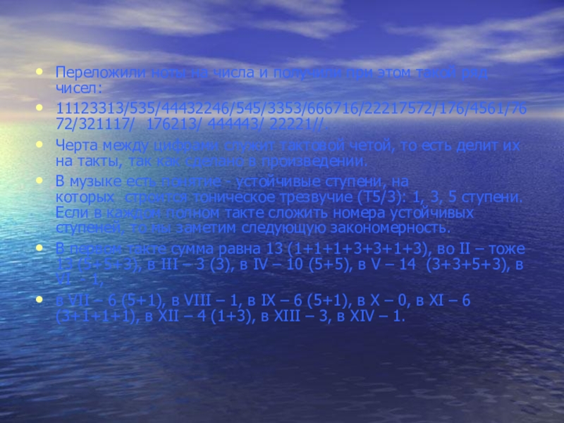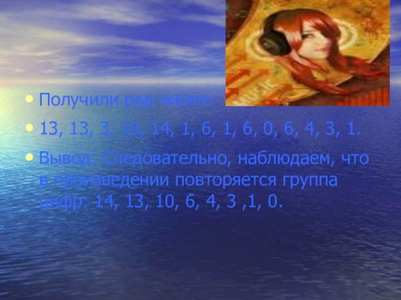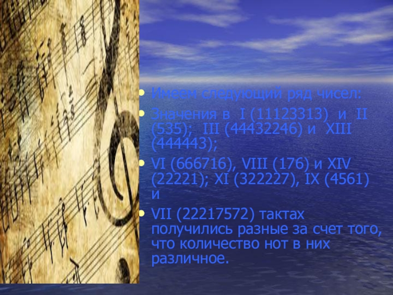Слайд 18Переложили ноты на числа и получили при этом такой ряд чисел: