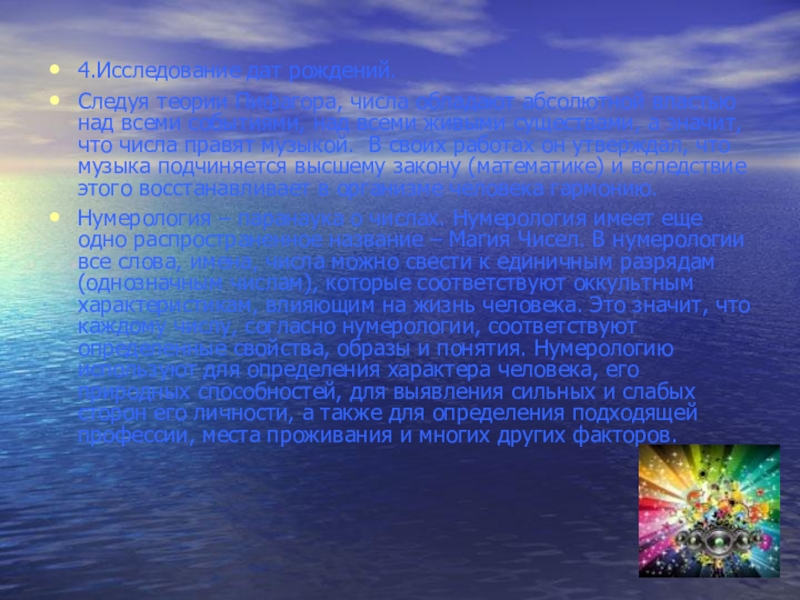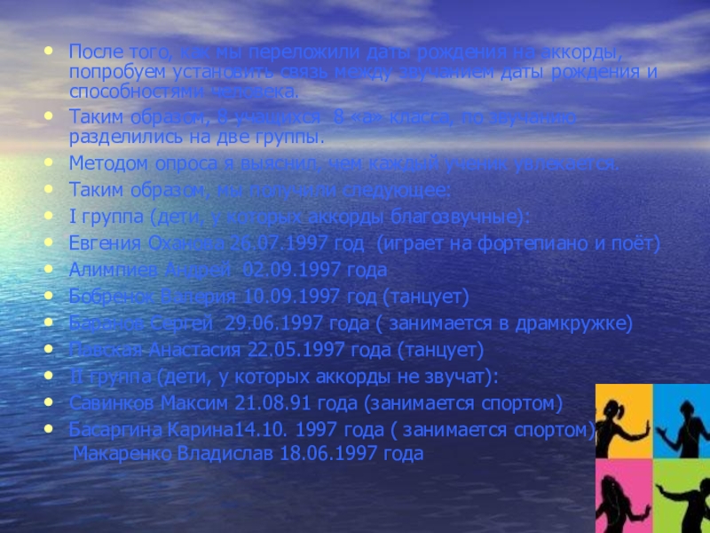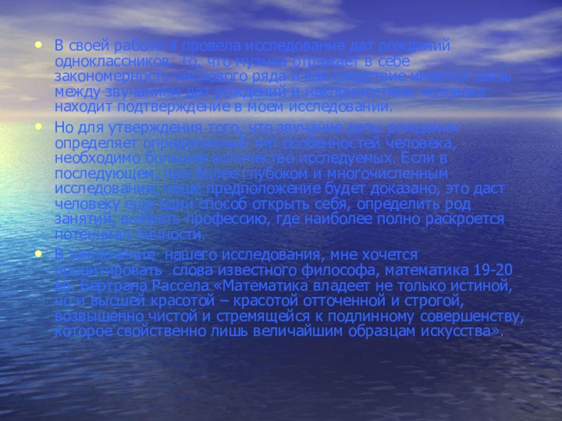 Но для утверждения того, что звучание даты рождения определяет определенный тип особенностей человека, необходимо большее количество исследуемых. Если в последующем, при более глубоком и многочисленным исследовании, наше предположение будет доказано, это даст человеку еще один способ открыть себя, определить род занятий, выбрать профессию, где наиболее полно раскроется потенциал личности.