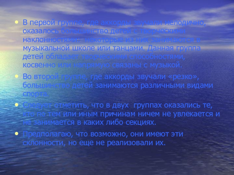 Слайд 26В первой группе, где аккорды звучали мелодично, оказалось большинство детей с