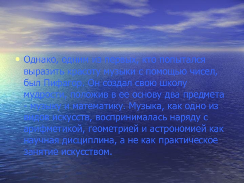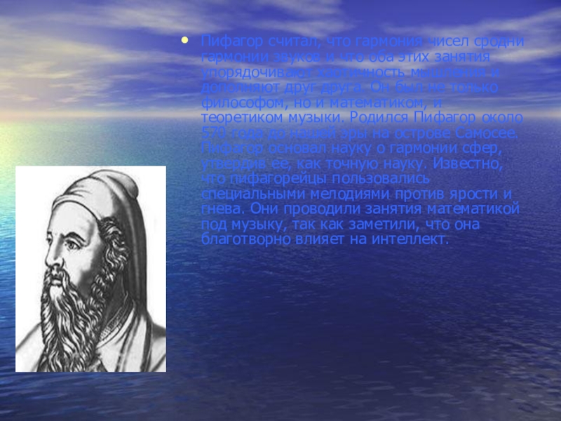 этих занятия упорядочивают хаотичность мышления и дополняют друг друга. Он был не только философом, но и математиком, и теоретиком музыки. Родился Пифагор около 570 года до нашей эры на острове Самосее. Пифагор основал науку о гармонии сфер, утвердив ее, как точную науку. Известно, что пифагорейцы пользовались специальными мелодиями против ярости и гнева. Они проводили занятия математикой под музыку, так как заметили, что она благотворно влияет на интеллект.