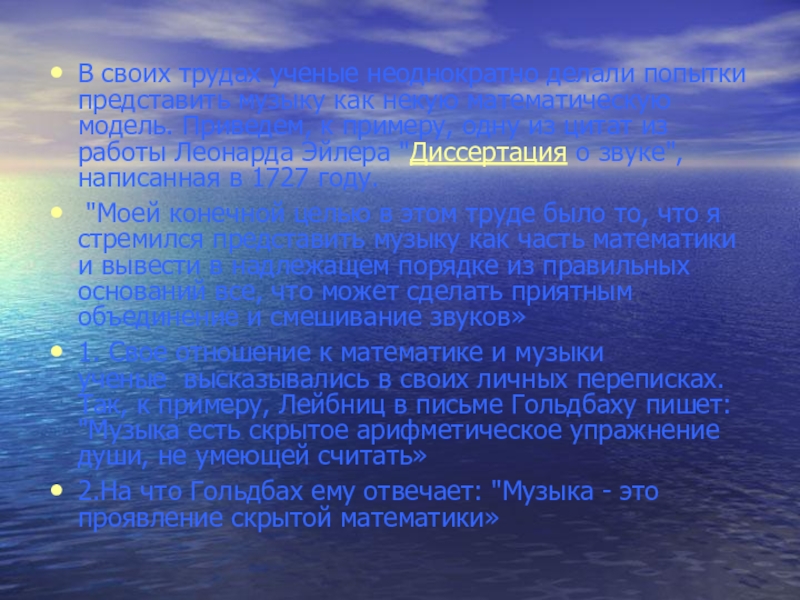 1. Свое отношение к математике и музыки ученые высказывались в своих личных переписках. Так, к примеру, Лейбниц в письме Гольдбаху пишет: "Музыка есть скрытое арифметическое упражнение души, не умеющей считать»