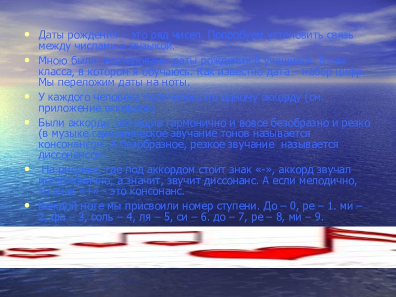 Мною были исследованы даты рождения 8 учащихся 8 «а» класса, в котором я обучаюсь. Как известно дата – набор цифр. Мы переложим даты на ноты.