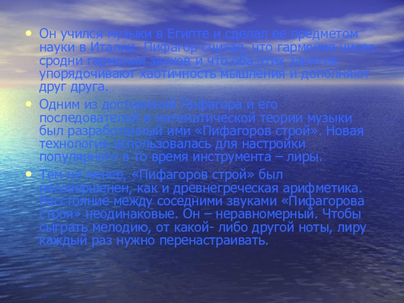 Слайд 14Он учился музыки в Египте и сделал ее предметом науки в