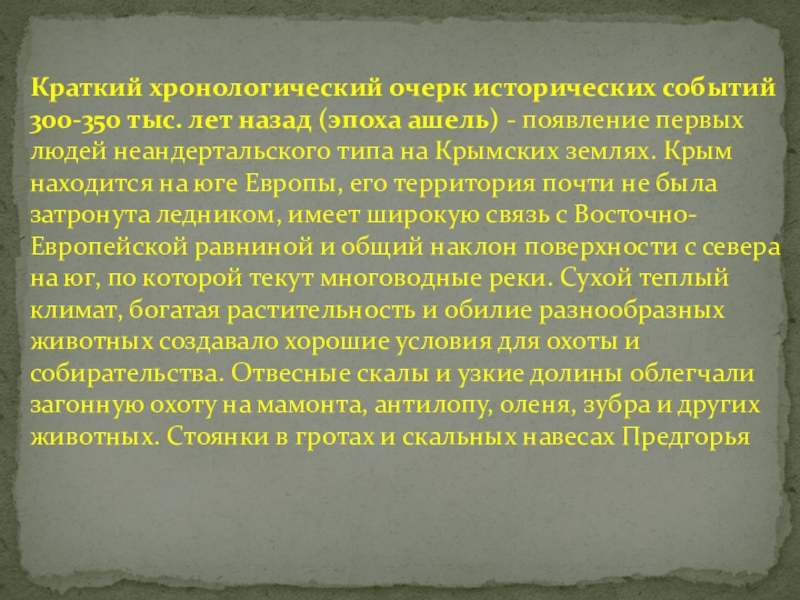 первых людей неандертальского типа на Крымских землях. Крым находится на юге Европы, его территория почти не была затронута ледником, имеет широкую связь с Восточно-Европейской равниной и общий наклон поверхности с севера на юг, по которой текут многоводные реки. Сухой теплый климат, богатая растительность и обилие разнообразных животных создавало хорошие условия для охоты и собирательства. Отвесные скалы и узкие долины облегчали загонную охоту на мамонта, антилопу, оленя, зубра и других животных. Стоянки в гротах и скальных навесах Предгорья