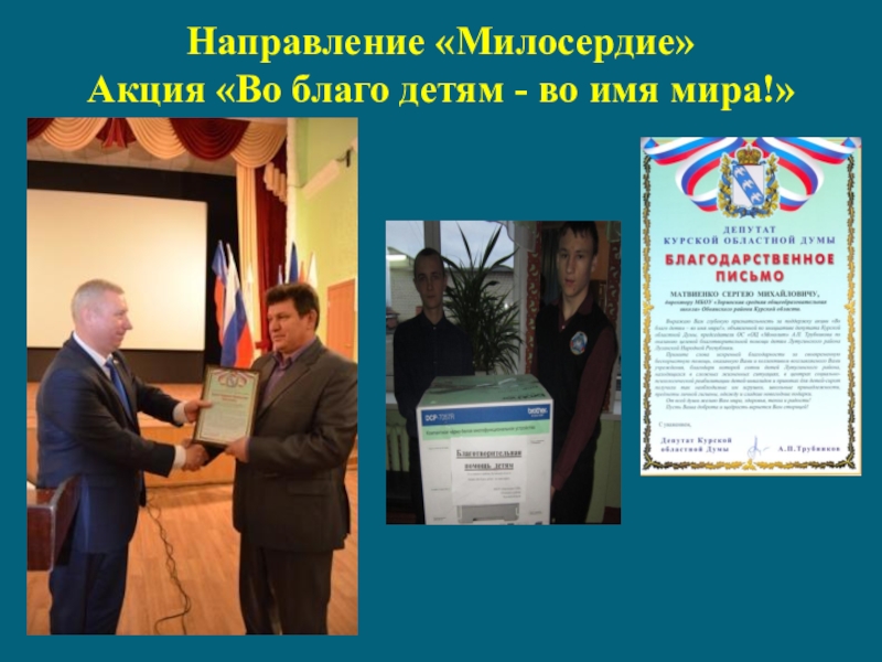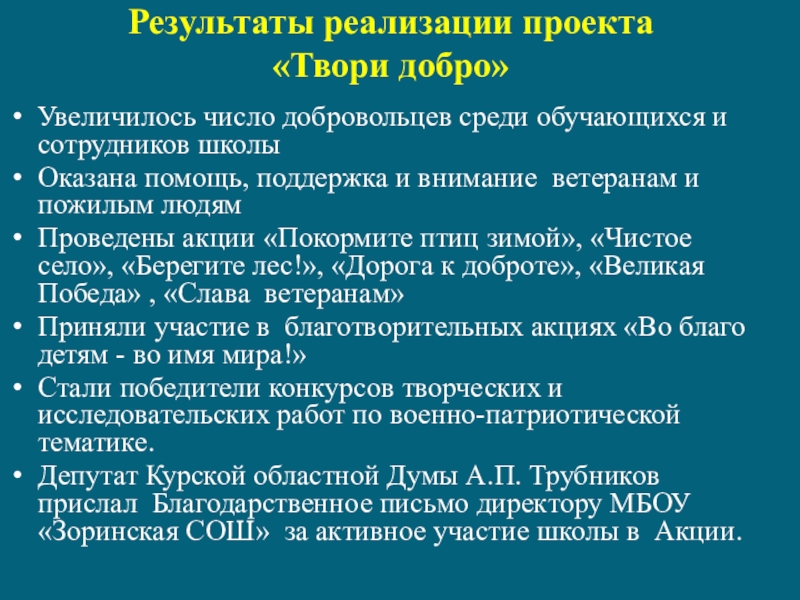 Депутат Курской областной Думы А.П. Трубников прислал Благодарственное письмо директору МБОУ «Зоринская СОШ» за активное участие школы в Акции.