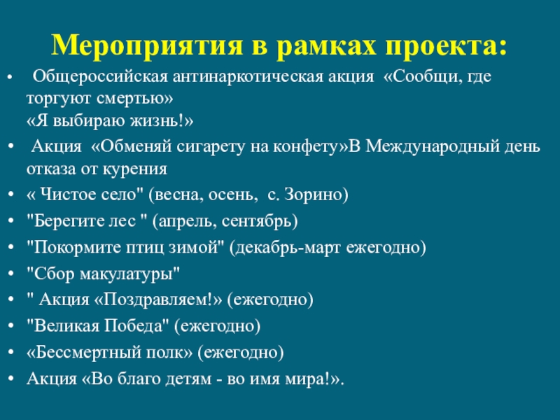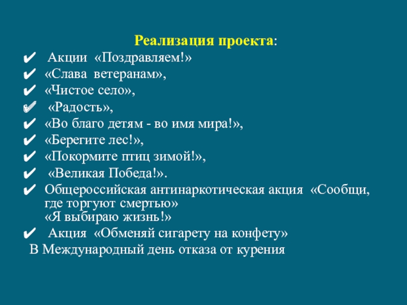 Проведены акции «Покормите птиц зимой», «Чистое село», «Берегите лес!», «Дорога к доброте», «Великая Победа» , «Слава ветеранам»