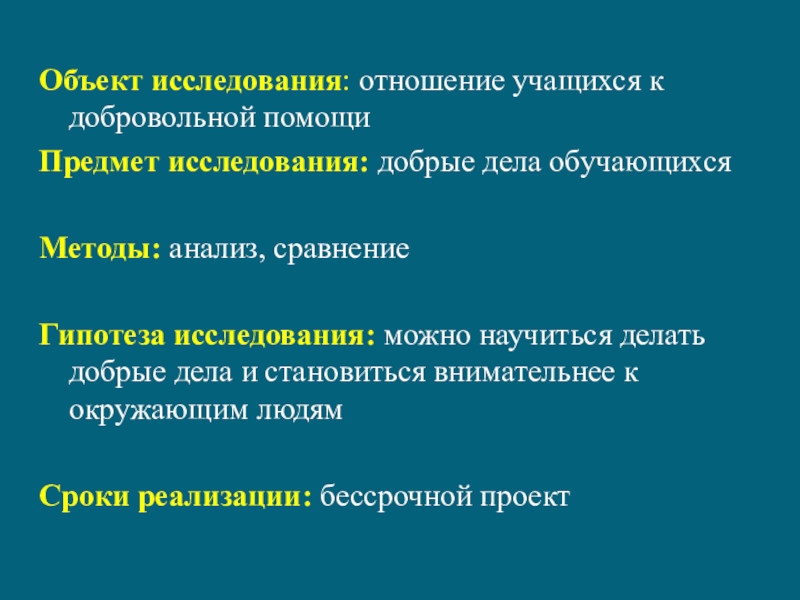 Слайд 5Объект исследования: отношение учащихся к добровольной помощи