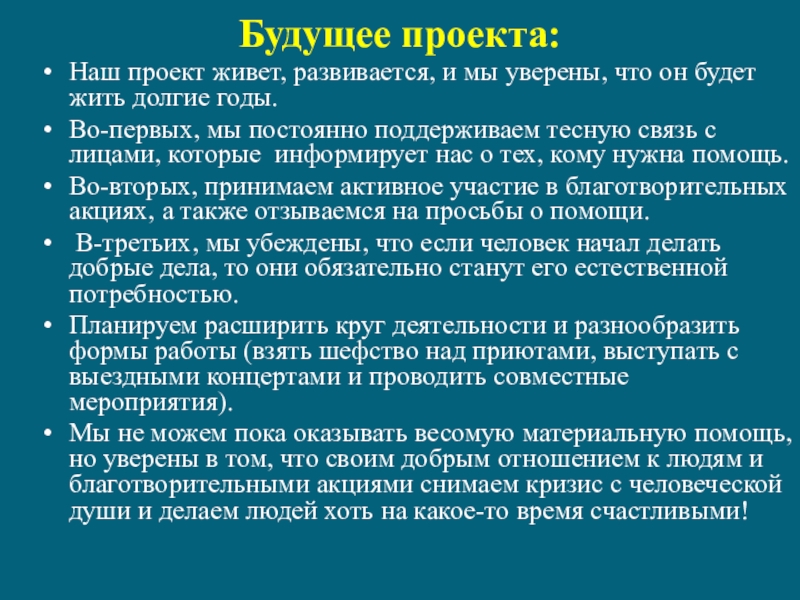 Планируем расширить круг деятельности и разнообразить формы работы (взять шефство над приютами, выступать с выездными концертами и проводить совместные мероприятия).