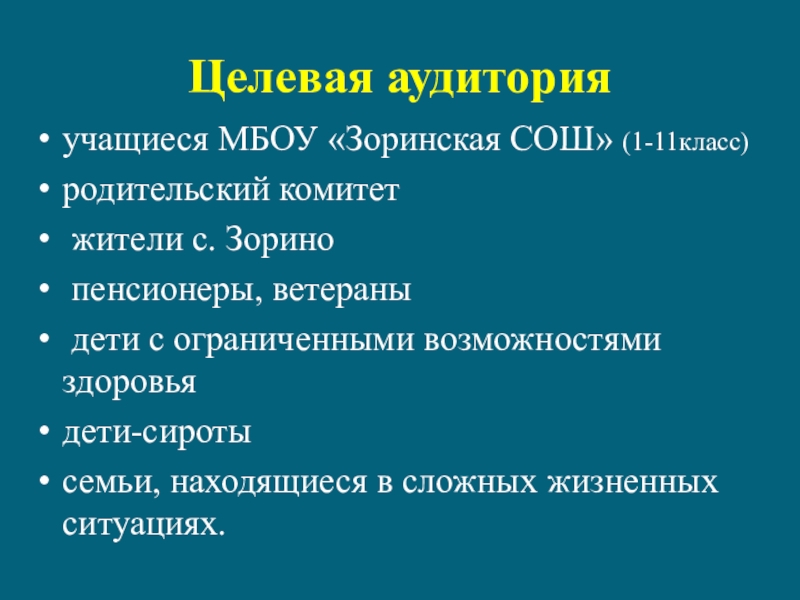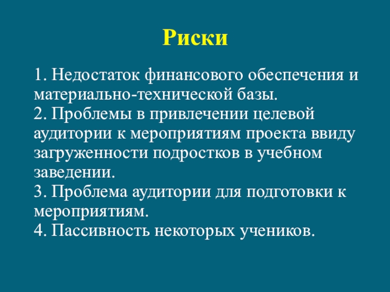 аудитории к мероприятиям проекта ввиду загруженности подростков в учебном заведении.