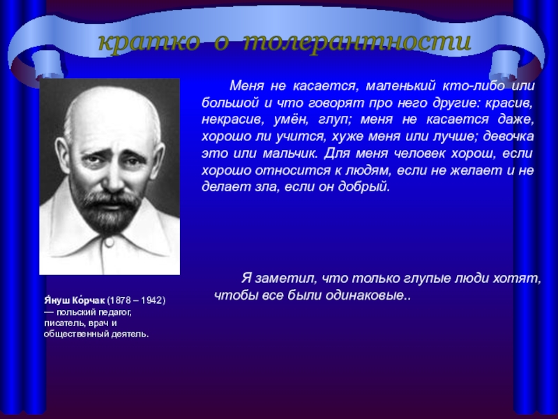 Меня не касается, маленький кто-либо или большой и что говорят про него другие: красив, некрасив, умён, глуп; меня не касается даже, хорошо ли учится, хуже меня или лучше; девочка это или мальчик. Для меня человек хорош, если хорошо относится к людям, если не желает и не делает зла, если он добрый.