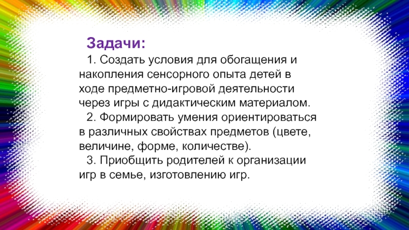 Задачи:1. Создать условия для обогащения и накопления сенсорного опыта детей в ходе предметно-игровой деятельности через игры с