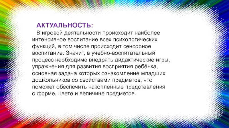 АКТУАЛЬНОСТЬ:В игровой деятельности происходит наиболее интенсивное воспитание всех психологических функций, в том числе происходит сенсорное воспитание. Значит,