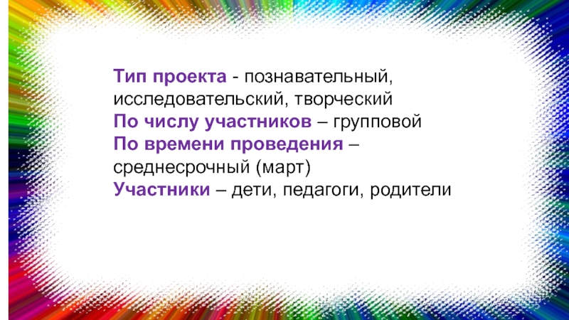 Тип проекта - познавательный, исследовательский, творческийПо числу участников – групповойПо времени проведения – среднесрочный (март)Участники – дети, педагоги, родители