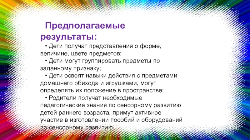 Предполагаемые результаты:• Дети получат представления о форме, величине, цвете предметов;• Дети могут группировать предметы по заданному признаку;•