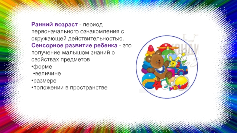 Слайд 8Ранний возраст - период первоначального ознакомления с окружающей действительностью. Сенсорное развитие