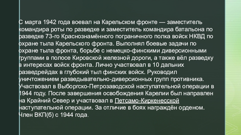 Слайд 9С марта 1942 года воевал на Карельском фронте — заместитель командира роты