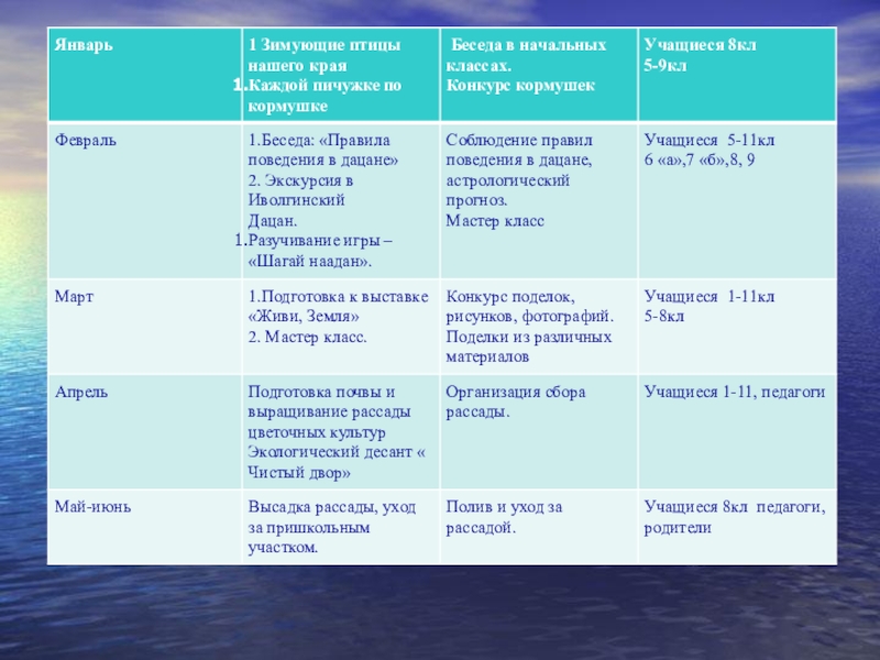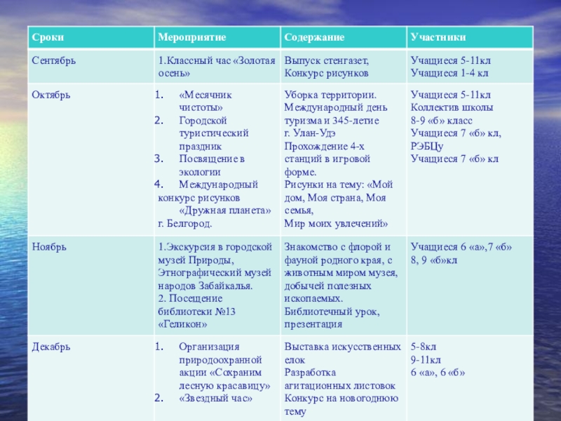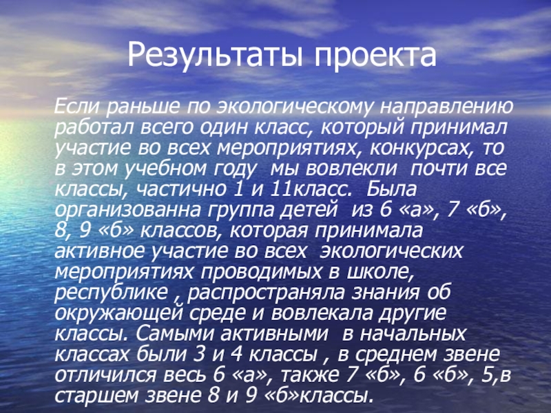 класс, который принимал участие во всех мероприятиях, конкурсах, то в этом учебном году мы вовлекли почти все классы, частично 1 и 11класс. Была организованна группа детей из 6 «а», 7 «б», 8, 9 «б» классов, которая принимала активное участие во всех экологических мероприятиях проводимых в школе, республике , распространяла знания об окружающей среде и вовлекала другие классы. Самыми активными в начальных классах были 3 и 4 классы , в среднем звене отличился весь 6 «а», также 7 «б», 6 «б», 5,в старшем звене 8 и 9 «б»классы.
