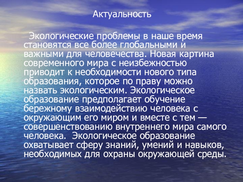 Экологические проблемы в наше время становятся все более глобальными и важными для человечества. Новая картина современного мира с неизбежностью приводит к необходимости нового типа образования, которое по праву можно назвать экологическим. Экологическое образование предполагает обучение бережному взаимодействию человека с окружающим его миром и вместе с тем — совершенствованию внутреннего мира самого человека. Экологическое образование охватывает сферу знаний, умений и навыков, необходимых для охраны окружающей среды.
