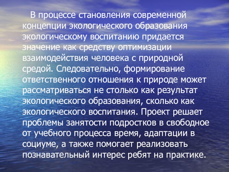 воспитанию придается значение как средству оптимизации взаимодействия человека с природной средой. Следовательно, формирование ответственного отношения к природе может рассматриваться не столько как результат экологического образования, сколько как экологического воспитания. Проект решает проблемы занятости подростков в свободное от учебного процесса время, адаптации в социуме, а также помогает реализовать познавательный интерес ребят на практике.