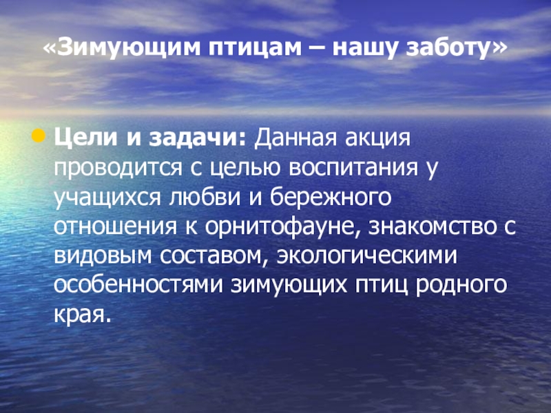 целью воспитания у учащихся любви и бережного отношения к орнитофауне, знакомство с видовым составом, экологическими особенностями зимующих птиц родного края.