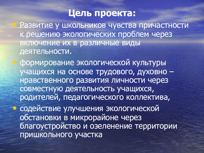 формирование экологической культуры учащихся на основе трудового, духовно – нравственного развития личности через совместную деятельность учащихся, родителей, педагогического коллектива,