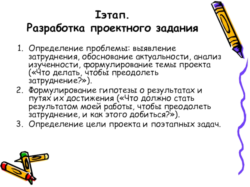 Iэтап.  Разработка проектного заданияОпределение проблемы: выявление затруднения, обоснование актуальности, анализ изученности, формулирование темы проекта («Что делать,