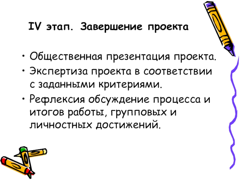 IV этап. Завершение проектаОбщественная презентация проекта.Экспертиза проекта в соответствии с заданными критериями.Рефлексия обсуждение процесса и итогов работы,