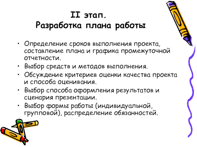 II этап.  Разработка плана работыОпределение сроков выполнения проекта, составление плана и графика промежуточной отчетности.Выбор средств и